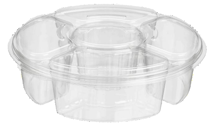 Plato dos piezas Essentials de 142oz con 5 compartimentos. Dimensiones internas: 11.8" x 11.8" x 3.5". Dimensiones externas: 13" x 13" x 4". 100% reciclable.
